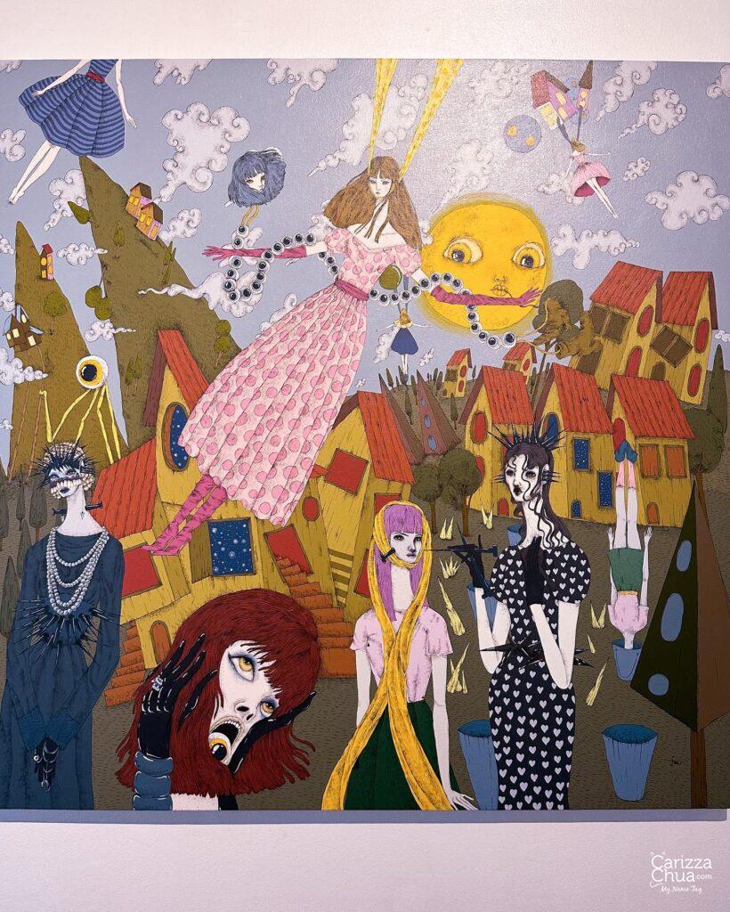 Eyeballs, balloons, floating houses, and bodies hanging by the ropes. Full of fantasy and creativity.