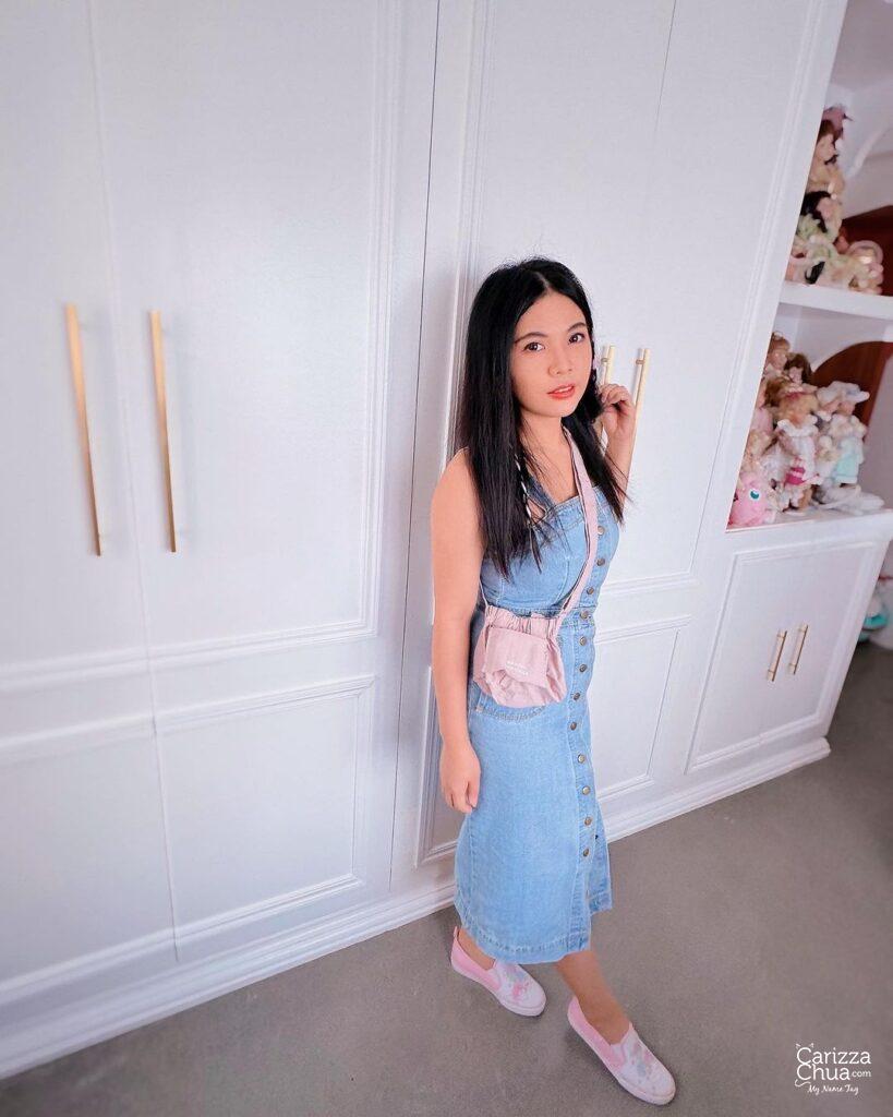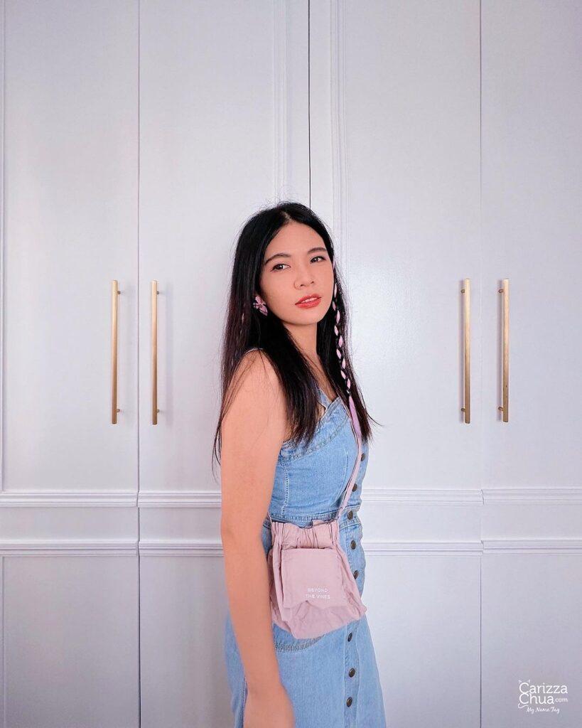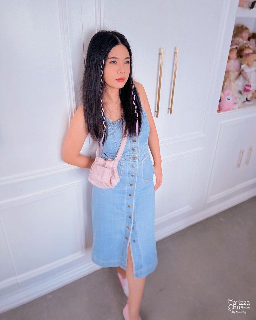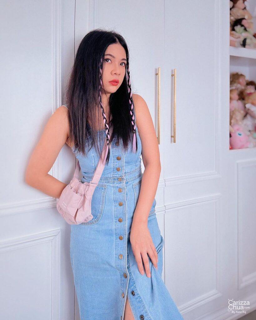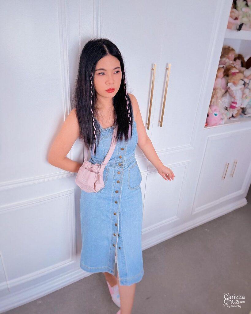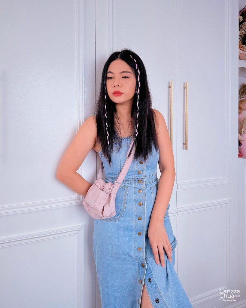 I really love this denim dress as it can go well from sweet casual to a sexy night out look when you show off its dangerously high-slit feature paired maybe with a thigh-high denim boots. But we’re going for a sweet casual look for now, channeling my Super Shy by New Jeans era.