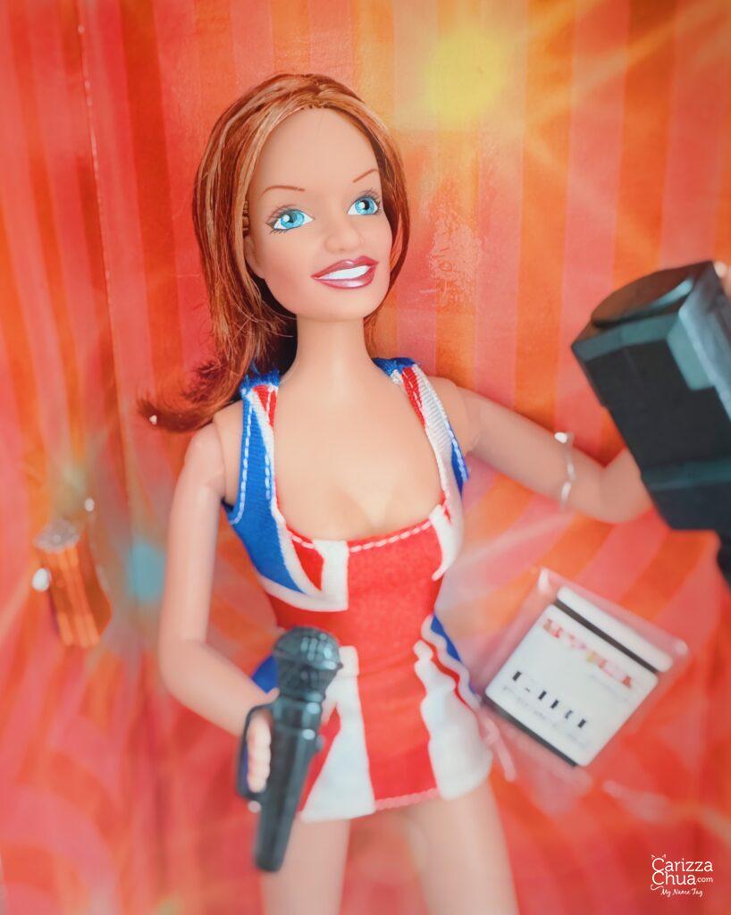 The Geri Halliwell doll from this collection has highlighted red hair and is wearing a Union Jack dress. It has red platform boots, video camera, magazine and carries a black microphone.
