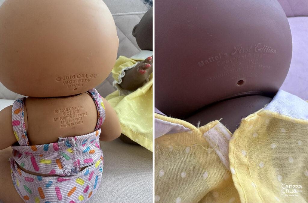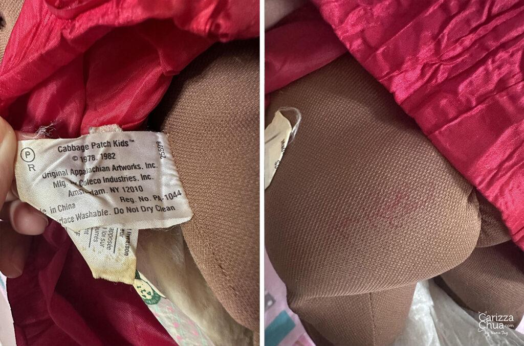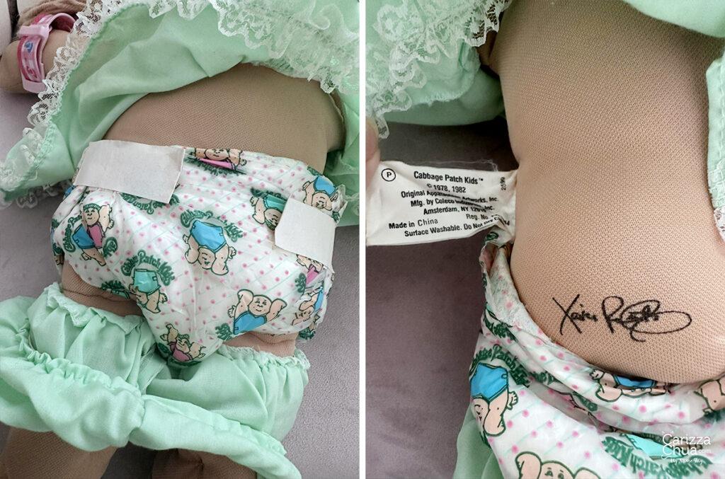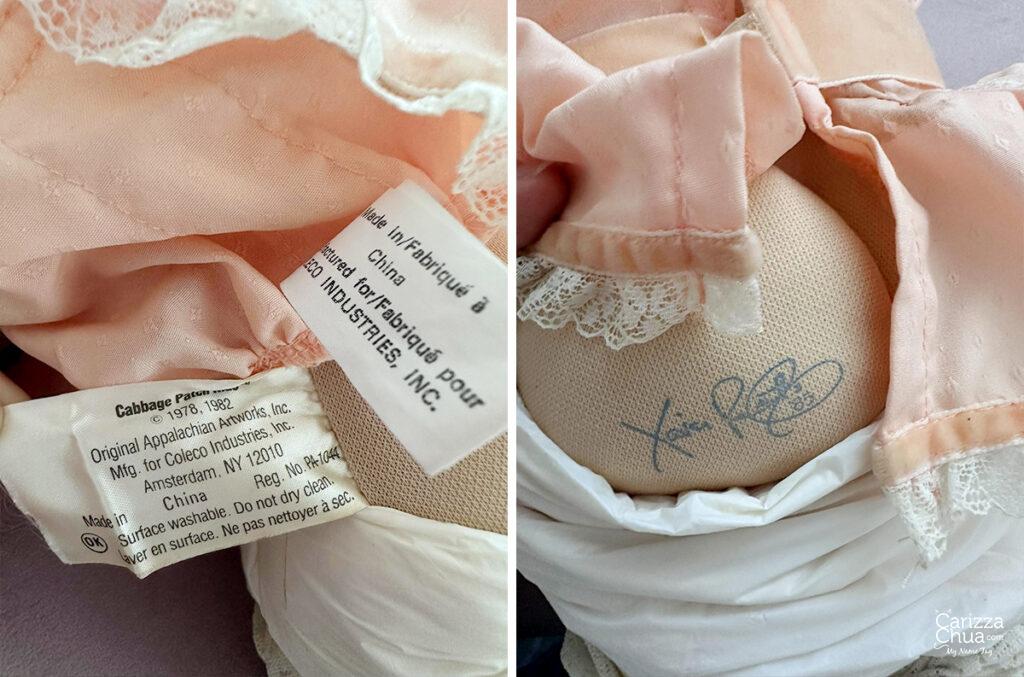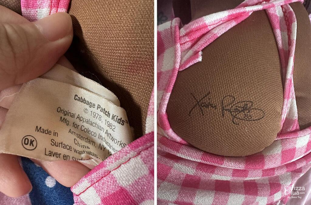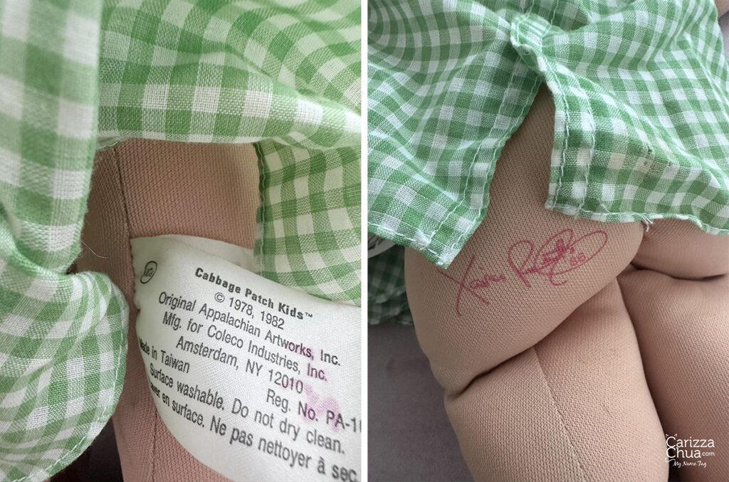 You can easily identify from which year it came from by checking the markings at the back of its head, the side tag on its body or the Xavier Roberts signature stamp on the bum. Some have dates, others do not but the dolls can also be identified by year based on its signature color. Some collectors say when the signature is in black with no date, it will be one of the earliest CPK dolls! For the vintage ones, here are the color codes: