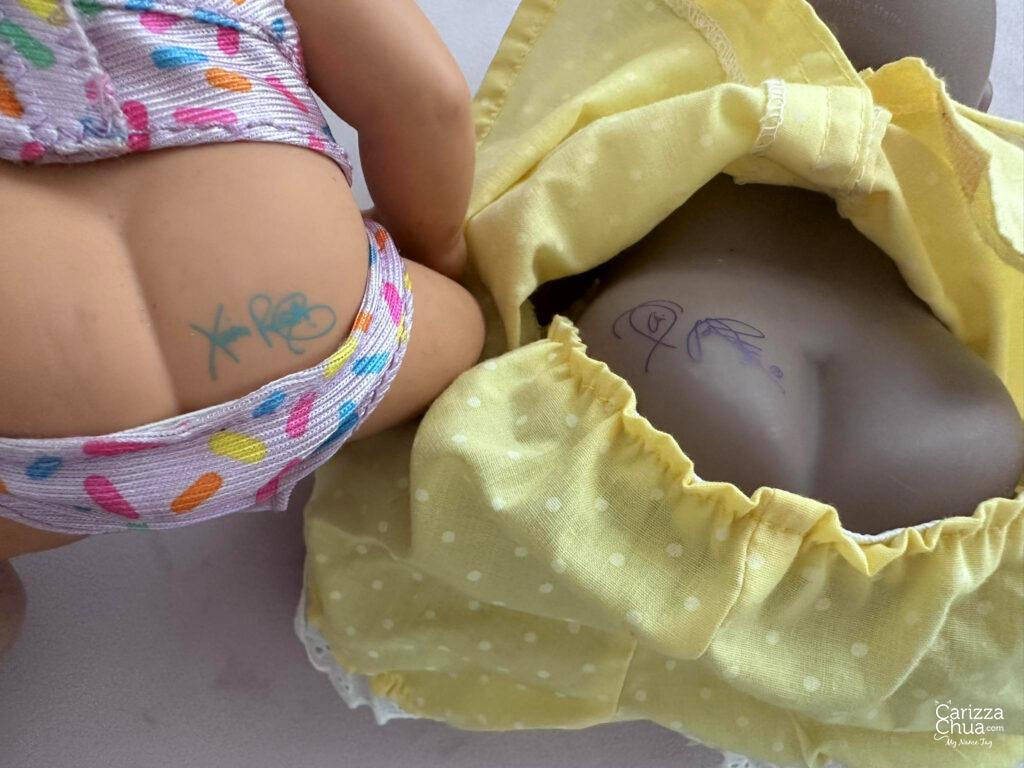 While the peach one with pacifier has the blue signature (1985) and OK factory code on the side body tag: