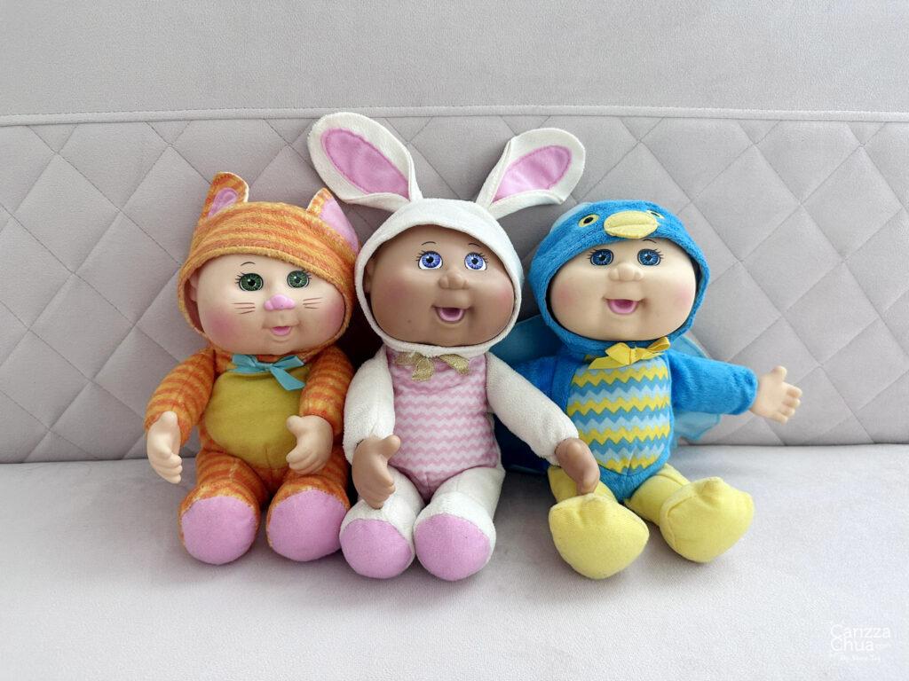 Meet the kiddos: Cabbage Patch Kids Cuties Collection Farm Friends, Kallie The Kitty Baby Doll (2016), Phoebe Bunny (2019), and Forest Friend, Archer Owl (2017).