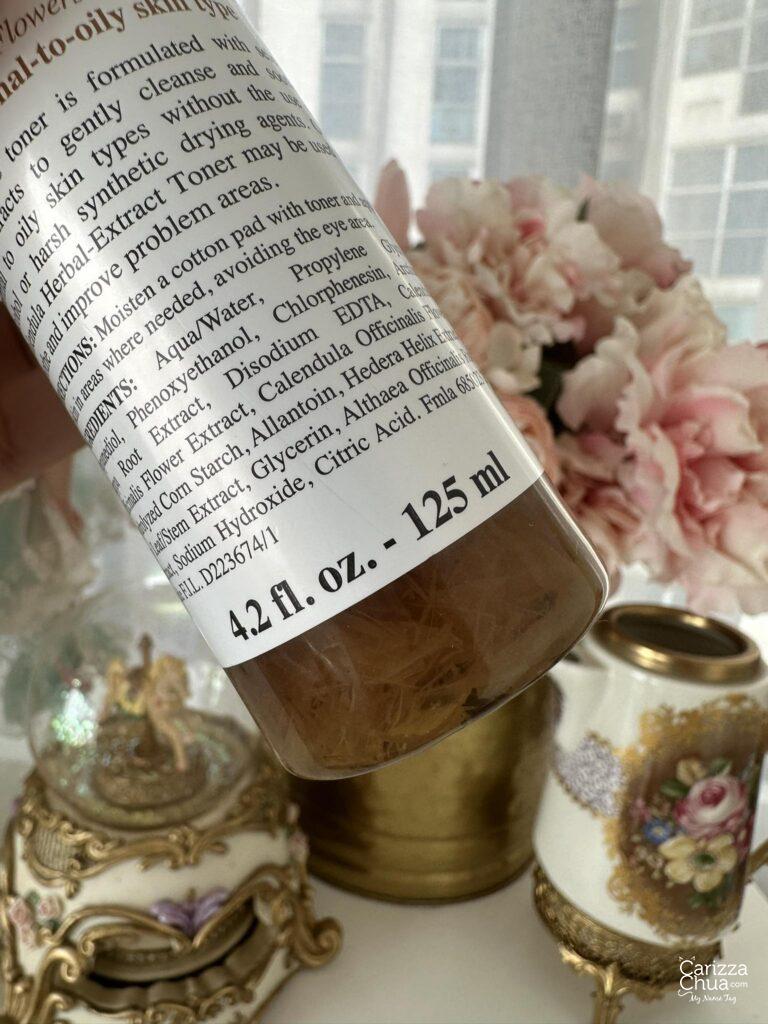 This toner contains whole Calendula flowers and select herbal extracts as you can see at the bottom of its container that effectively (at least for me) cleanse and soothe the surface of the skin while removing dead cells without the alcohol or any harsh synthetic drying agents.