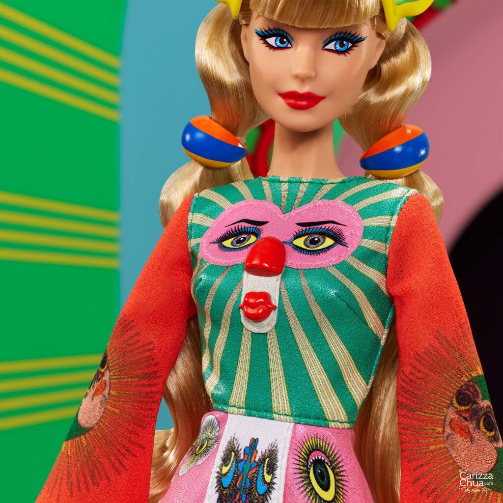 This Barbie doll is wearing a multi-tiered pleated pleather dress adorned with Tanaami artwork and a 3D face on her bodice. Her yellow headdress features inquisitive eyes with vinyl eyelashes, along with a central eye at the crown—a celebration of art and fashion that sees all and reveals nothing.