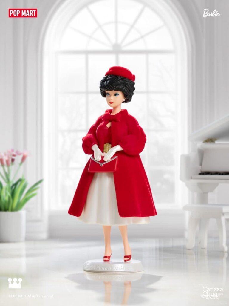 The POP MART x Barbie collection features various Barbie dolls reimagined in different iconic eras. On the pink carpet, we have 1962 Silken Flame, The Original 1959 Barbie, and 1996 Jewel Hair Mermaid Barbie.
